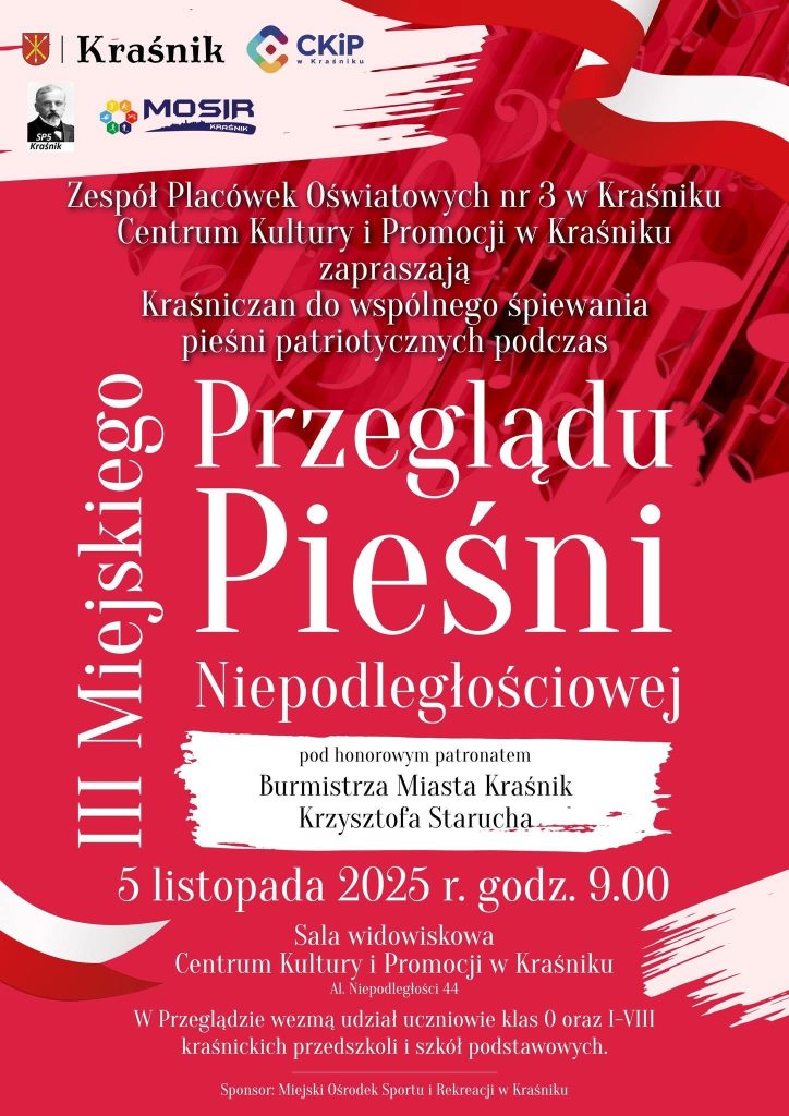 5 listopada po raz trzeci odbędzie się 🇵🇱🎼 Miejski Przegląd Pieśni Niepodległościowej pod patronatem honorowym Burmistrza Miasta Kraśnik.
