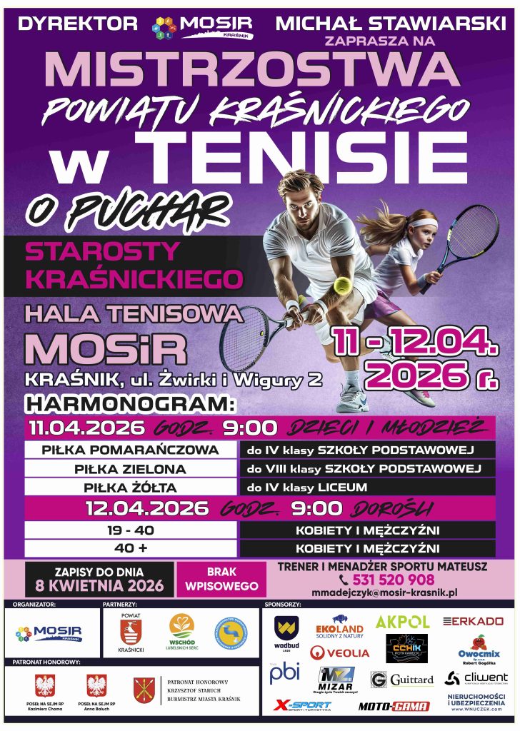 Dyrektor MOSiR Kraśnik Michał Stawiarski, serdecznie zaprasza na Mistrzostwa Powiatu Kraśnickiego w Tenisie o Puchar Starosty Kraśnickiego! To doskonała okazja, aby sprawdzić swoje umiejętności na korcie i spędzić aktywnie weekend.